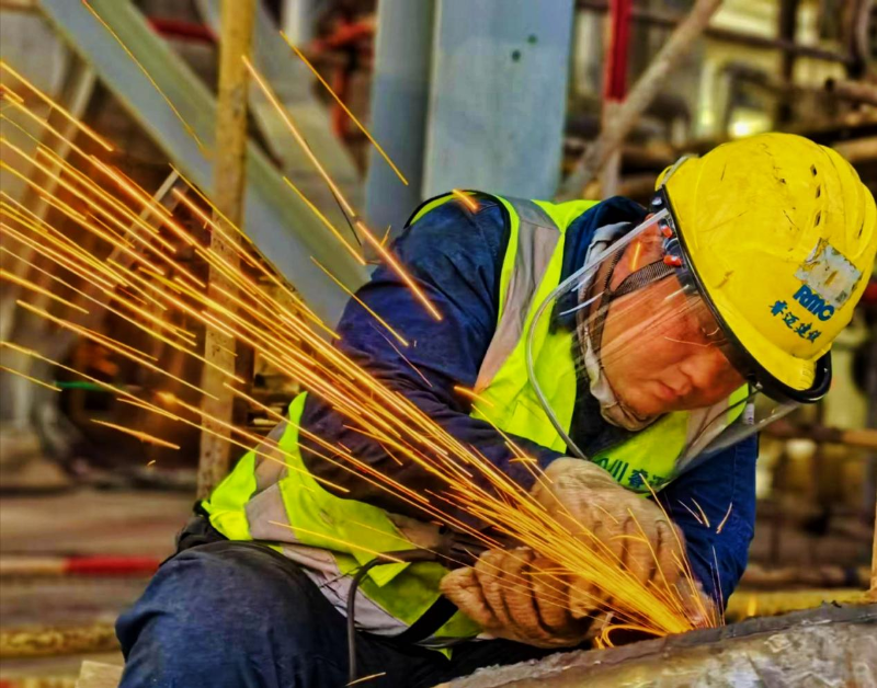 当砂轮机火花划破现场的夜幕,焊花如星雨般在钢铁上绽放。在热火朝天的检修现场,一位身着反光背心的焊接人正凝神聚力,手中的焊枪仿佛延伸的画笔,在冰冷的金属上勾勒出滚烫的轨迹。黄色安全帽上“睿迈建设”的字样在火花映照下格外醒目,护目镜后的双眼专注如鹰,每一道焊缝的走向、每一次电流的强弱,都倾注着对极致的追求。这不是普通的焊接作业,这是新时代产业工人用匠心与汗水谱写的劳动赞歌。