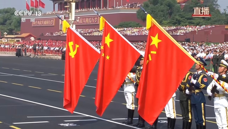 云观京华盛况,红旗漫卷,三军宏列。铁阵雄师齐浩荡,十里长街声彻。银翼穿空,钢流耀道,一派神威绝。峥嵘何易,此时犹缅先烈。