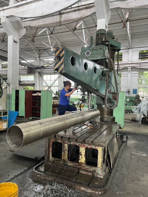 今日,在大型摇臂钻床前,家英同志正全神贯注地操作着。她熟练地调整着钻床参数,眼神紧紧锁定在巨大的金属管材上,精准地进行钻孔作业。金属碎屑纷飞,汗水湿透了她的衣衫,但她的动作依旧沉稳、精准。