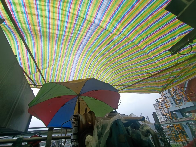 指令下达的瞬间,团队迅速切换状态:有人搬来彩条棚布,有人固定支撑,还有人撑起一把彩色大伞,为设备临时构筑起“遮雨屏障”。雨水淅淅沥沥打在棚布上,棚下的101JA设备却在众人的守护下,免遭雨水侵袭。那简陋却严密的棚子,像一个温暖的茧,将设备与外界的湿气隔绝开来。