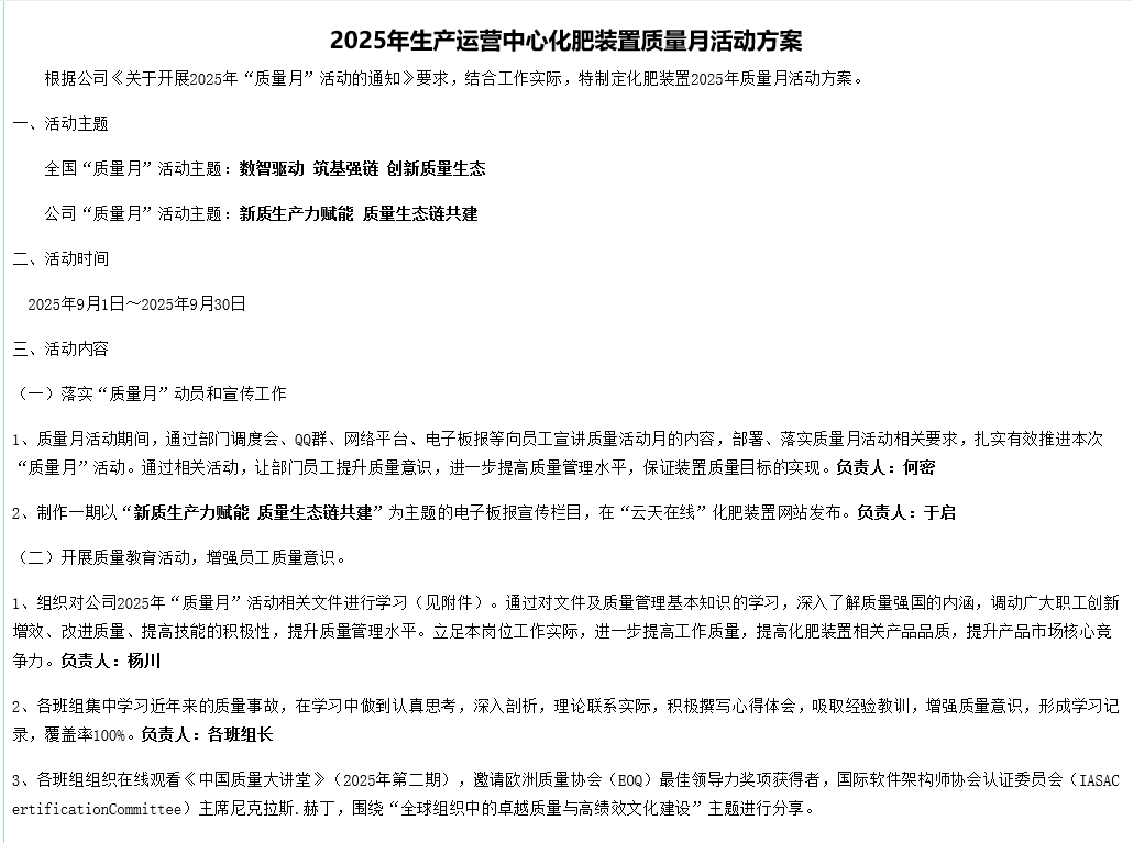 质量是企业生存和发展的基石。化肥装置将持续以质量月为契机,深化全面质量管理的推广与实践,不断夯实管理基础、提升产品与服务品质,为实现高质量发展注入持久动力。