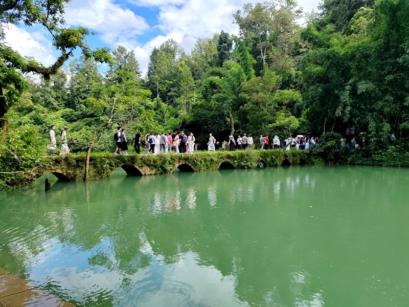 景区的灵魂地标当属小七孔古桥,这座始建于清代的石拱桥,横跨在响水河上,桥身爬满青苔,护栏上的石雕古朴雅致,桥下的河水清澈见底,倒映着古桥与两岸的葱郁林木,宛如水墨丹青。多少年来,它静静伫立,见证着往来游人的脚步,也见证着这片山水的四季更迭。