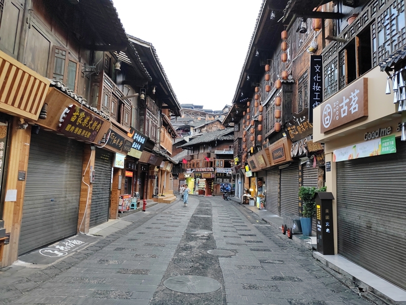 沿着青石板铺就的古街漫步,便能邂逅苗寨最浓郁的烟火气。街边的小店挂满了苗族银饰,银项圈、银手镯在阳光下闪着冷冽又华丽的光,匠人坐在店门口捶打银片,叮当声清脆悦耳;转角处的蜡染作坊里,蓝白相间的布料垂挂着,染料的清香混着草木气息扑面而来。更不能错过苗家美食:热气腾腾的酸汤鱼,酸鲜开胃,鱼肉嫩滑;外酥里糯的糍粑,裏上黄豆粉,甜香四溢;还有香气扑鼻的腊肉、竹筒饭,每一口都是苗寨独有的味道。