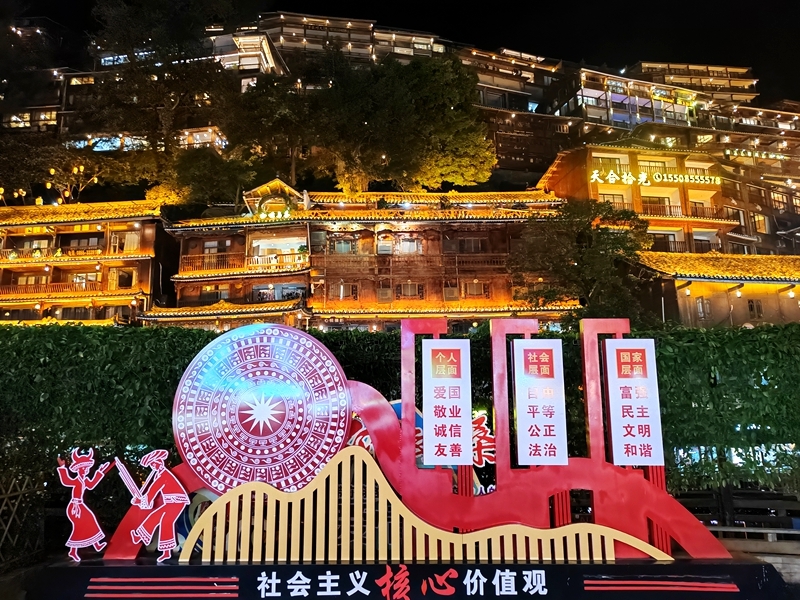 当夕阳沉入山巅,苗寨的灯光便一盏盏亮起。从观景台俯瞰,上千盏灯火沿着山势蔓延,形成一条璀璨的“灯河”,与夜空的星星交相辉映,分不清是天上星河还是人间灯火。此时的苗寨少了白日的喧闹,多了几分静谧与浪漫,晚风拂过,带着山间的清凉,耳边偶尔传来远处的芦笙声,让人沉醉在这温柔的夜色里,忘却尘世的烦恼。