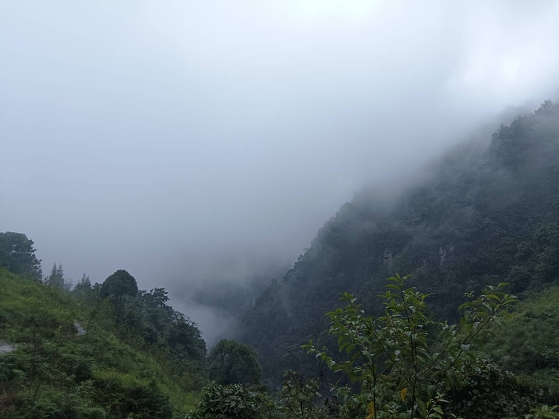 抵达山脚时,雨势渐密,此处海拔有1000多米,山间腾起乳白色的雾气。我们面临选择:驾车直达山顶,或徒步攀登。考虑到时间紧迫且雨势渐密,我们决定挑战“团岩44道拐”——这条蜿蜒上山的路,窄、陡、急,44个弯道各有幽默的提示牌,有的写着“我明白你一定会来”,有的写着“总有不期而遇的美好”,让紧张的车程多了几分趣味。