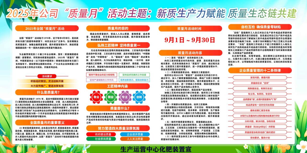2025年9月,我们迎来了第48个全国“质量月”,今年的活动主题是“数智驱动筑基强链创新质量生态”。这一主题紧密贴合当下时代发展需求,为公司在质量领域的提升与发展指明了方向。质量,是公司的生命线,更是国家综合实力的重要体现。从宏观层面来看,质量强国建设关乎国家经济的稳健发展,关乎在全球产业链、供应链...