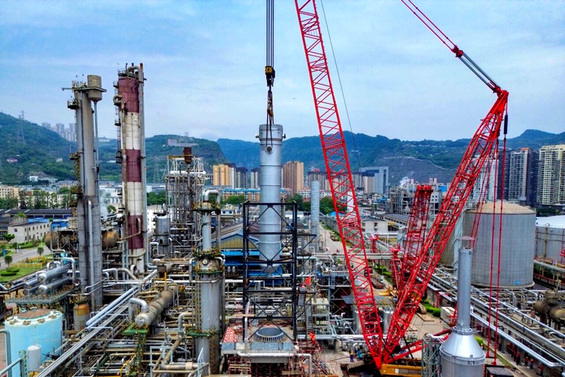至此,水富云天化节能降碳改造二期核心设备--重374吨、高25米的新合成塔壳体一次性吊装落座成功,这也是云天化发展史上唯二的重300吨以上的设备吊装。
