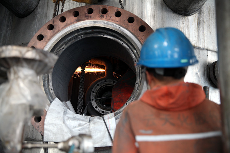 10月10日,记者在现场看到气化炉内外人孔都已经打开,作业人员进入到气化炉内部进行炉渣的清理,机械厂铆工班人员正准备进入环形空间,对旧烧嘴罩上下连接管进行切割。由于环形空间异常狭窄,铆工班员工只能用手持砂轮进行切割。