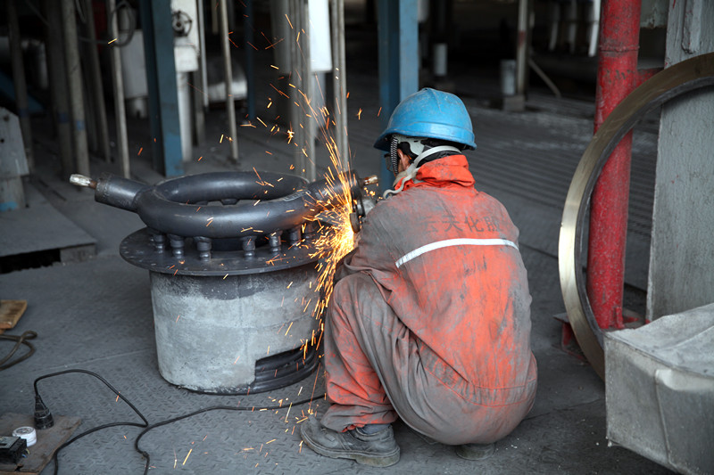 机械厂铆焊车间主任姚进:烧嘴罩损坏后,我们首先要把大盖打开,把煤烧嘴拆除,然后拆掉隔板才能看见烧嘴罩。我们要把烧嘴罩的进出口拆下后,才能更换新烧嘴罩,更换的难点主要在于烧嘴罩进出口组对和焊接,因为环形空间很狭小,操作起来很困难。