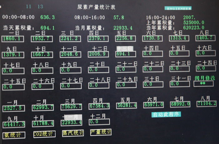 11月13日9时整,尿素车间DCS操作台显示,2013年累积生产尿素620000吨,圆满完成了集团公司年初下达的尿素生产目标。这是自2008年以来,公司首次顺利完成尿素生产计划的年度目标。