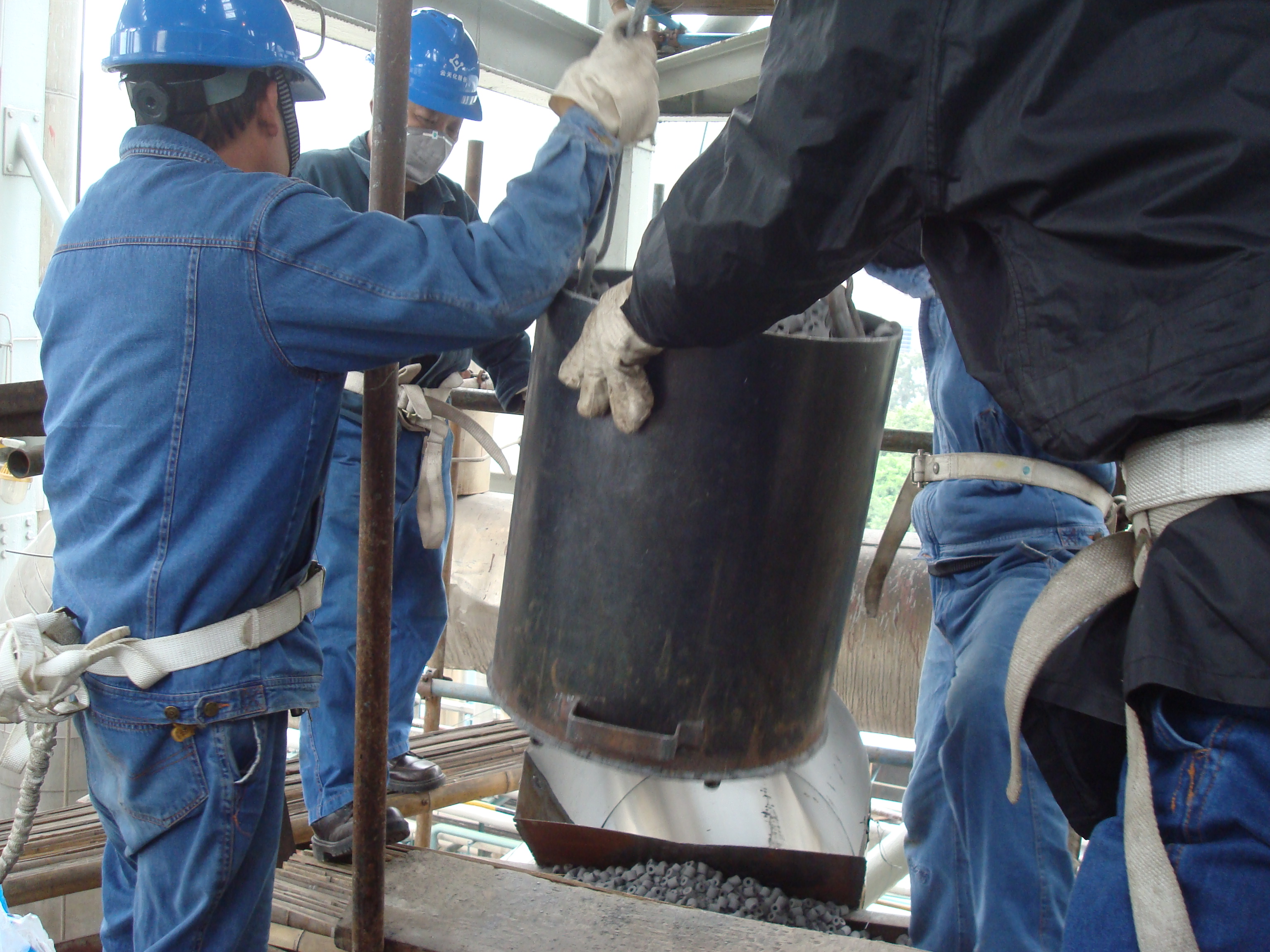 做好前期安全教育等各项准备工作后,56名突击队员进入合成界区,开始触媒卸出工作。突击队员们首先要把催化剂上部的六角砖等全部吊至地面,再把催化剂装入桶内吊出拉走。催化剂层卸完后,再卸出下层的氧化铝球,并吊至地面分类保管。共四层物料总重量达40余吨,要全部卸出其难度可想而知。都说“困难是生命的试金石”,复杂的作业流程,高强度的体力劳动,再加上是在炉内作业,空间狭小,突击队员们行动不便,困难和挑战考验着每一名队员的体力和毅力。但诸多困难,丝毫没有影响大家完成任务的信心和决心,突击队员们从早上8点干到晚上10点,轮番作战,力求用最快的速度完成触媒更换任务。