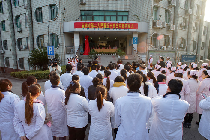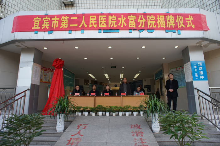 在全场热烈的掌声中,公司党委书记梁洪、水富县卫生局局长杨贵阶、宜宾市二医院院长孙广运、水富云天医院董事长何昌有共同为“宜宾市第二人民医院水富分院”揭牌。