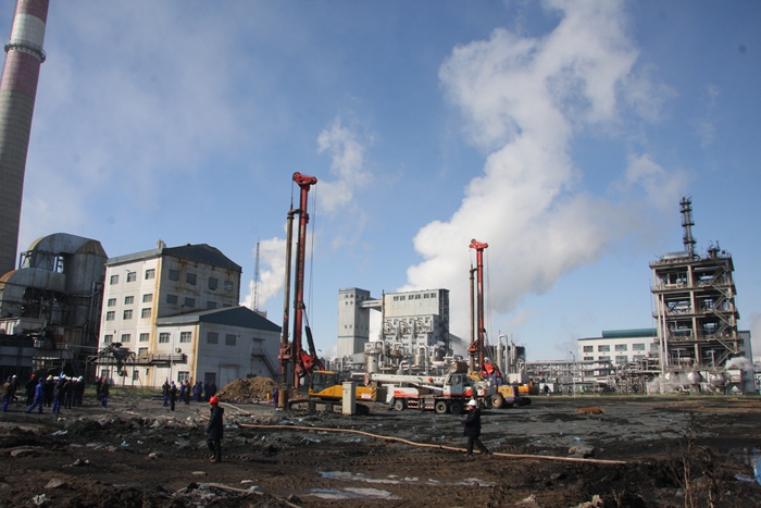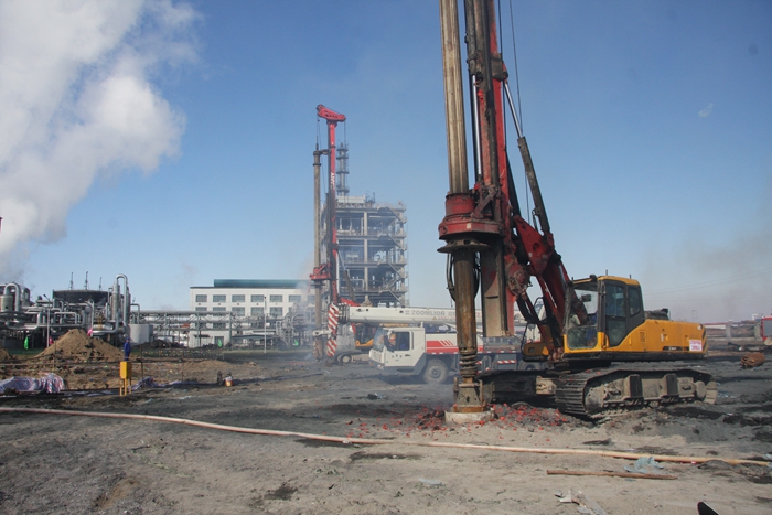 金新化工原料及产品结构调整项目主框架桩基工程由北京恒基中创基础工程有限公司承建,该框架共132根桩,分别是28根23米有效桩和104根45米有效桩。打桩施工采用旋挖工艺,该工艺泥浆循环利用,污染小,施工速度快。旋挖钻孔灌注桩采用泥浆护壁成孔法,现场由两台旋挖机同时工作,预计每天可挖成孔4个左右,预计4月底可以完成主框架桩基施工工作。