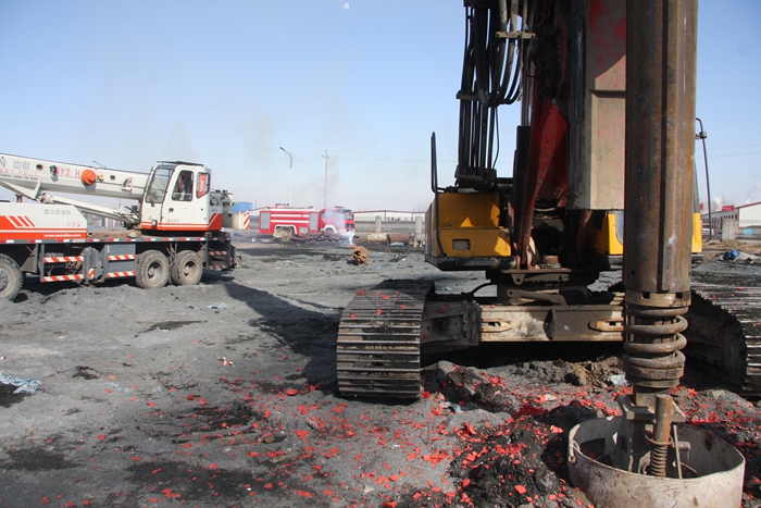 3月20日13时58分,金新化工原料及产品结构调整项目施工现场热闹非凡,随着公司副总经理李钢下达开工指令,两台旋挖机同时进行旋挖打桩,金新化工原料及产品结构调整项目主框架打下第一桩,标志着该项目的施工工作全面展开。