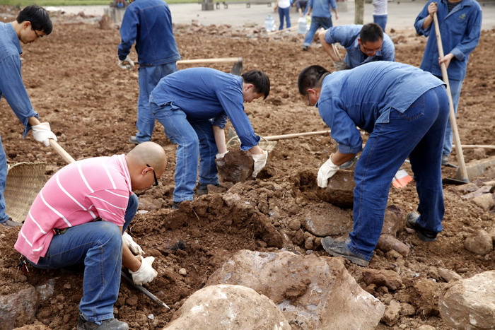 然而,对于还未种植植被的区域而言,任务就显得更加繁重,不仅需要翻松和平整区域内的泥土,还要把土里的石块挑拣并搬运出来。在很多人看来,铁锹和锄头都已经是儿时记忆中的物件了,而对于那些在城市长大的员工来说,翻土和锄地这样的劳动更是离自己很遥远,手握久违甚至陌生的铁锹和锄头,一时间还真不知道该如何下锄,面对坚硬的地面和硕大的石块,加上体力的不济和经验的缺乏,让看似简单的劳动变得异常艰辛,几个回合下来,人就感觉身体困倦,四肢酸痛,手上起了水泡。