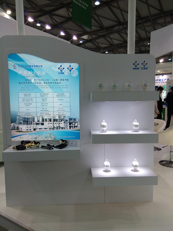 今年是云天化集团重大资产重组后,水富云天化首次以股份公司名义参展。公司通过整合参展资源,明确职责、分工,以统一的展台形象设计、宣传标识展示了云天化聚甲醛产品,以进一步提升公司聚甲醛产品在国际、国内市场的品牌形象和知名度。本次公司除了展示基础料M90、M270、M90-01、M25、M120外,重点展示了GF-25、ST-20等19个改性产品。同时,还实例展出管接件、机械配件、齿轮、电子电器等中高端制件。展会第一天,公司参会人员与来自海内外众多的的参展商、业界专家、经销商和终端客户等就聚甲醛产品的品牌、质量、应用领域等方面进行详细的交流,把云天化聚甲醛积极向客户推荐。