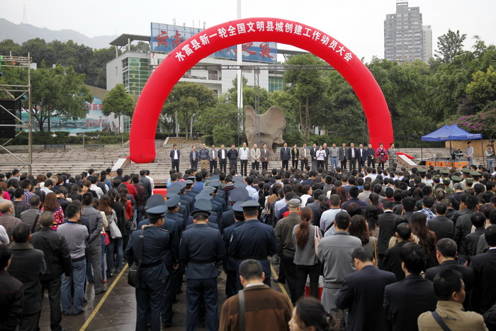 随后,社会各阶层代表分别发言。县委书记薛桂强宣布:新一轮全国文明县城创建工作启动。仪式上,公司45名志愿者与来自全县各级各部门的干部职工,各街道、社区群众,青年志愿者共计千余人一起参与了签名活动。水富县本次动员大会号召各级各部门各单位和广大干部群众,务必统一思想,深化认识,切实把水富县新一轮全国文明县城创建工作抓紧抓好,抓出成效。