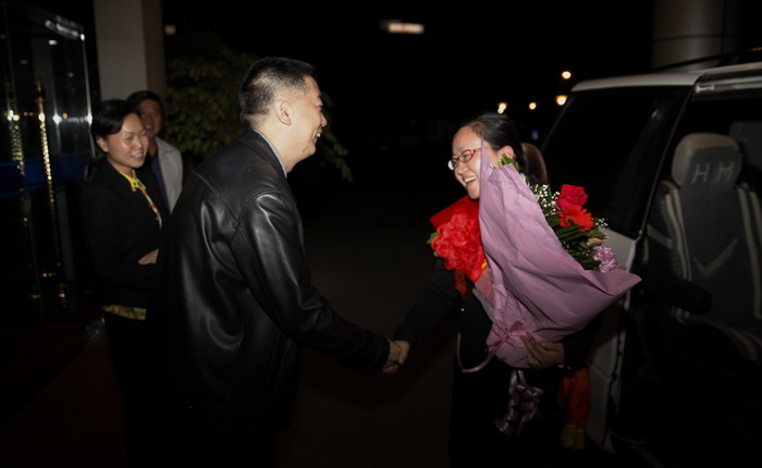 当晚10点,当刚从昆明领奖归来,身披绶带、胸佩奖章的劳动模范赵宁回到公司时,工会代表为向她献上了鲜花,公司领导梁洪、宋玉与赵宁亲切握手表示祝贺,称赞她是公司员工学习的榜样,是鼓舞公司员工干事创业的楷模,并与她合影留念。