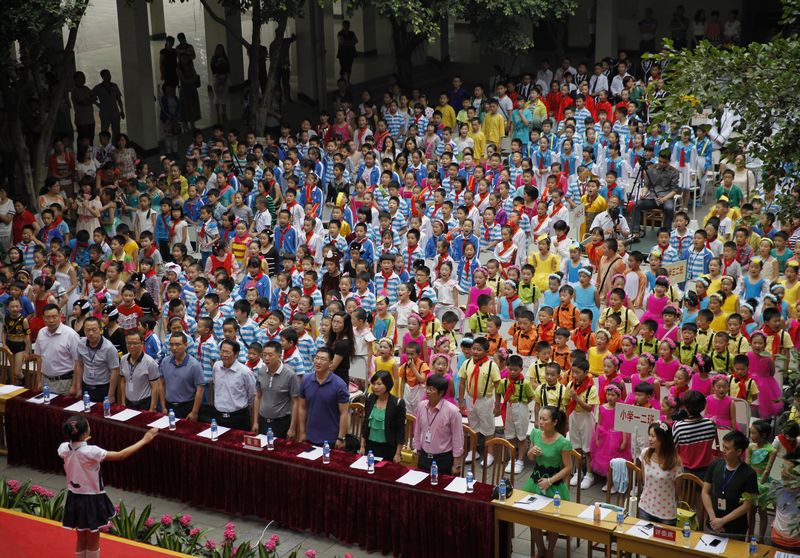伴随欢快的歌声,新少先队员入队仪式开始,100余名同学光荣加入中国少年先锋队组织。在鲜红的队旗下,新队员们庄重宣誓。