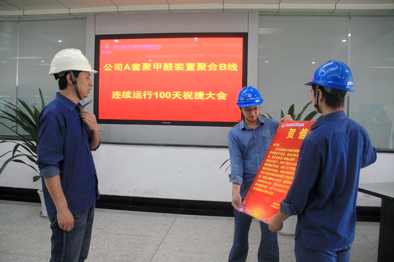 重庆分公司党委书记罗勇在主控室主持A套聚甲醛装置聚合B线连续运行100天祝捷大会。