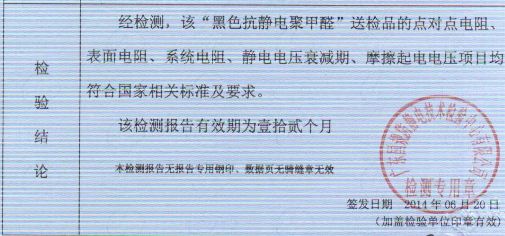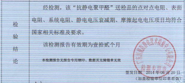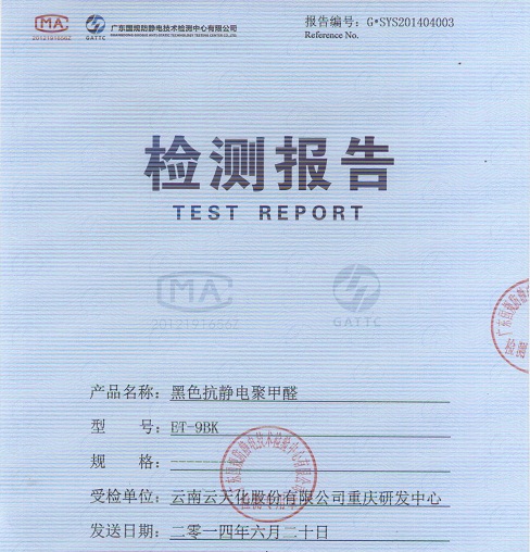 目前,云天化本色抗静电聚甲醛已经通过了两家客户的试用,为进一步推广产品,提供品质保障,我们针对抗静电聚甲醛进行了有检测资质的第三方测试。通过广东国规防静电技术检测中心测试,云天化两款抗静电产品的以上5个项目测试结果均符合国家相关标准及要求,并且符合《电子产品制造与应用系统防静电检测通用规范SJ/T10694-2006》的要求,说明云天化的抗静电聚甲醛已获得进入防静电领域的“通行证”。