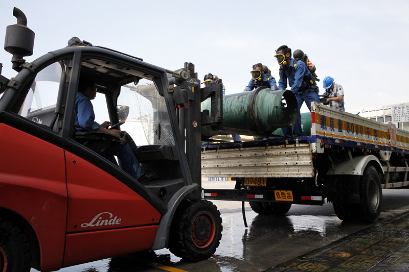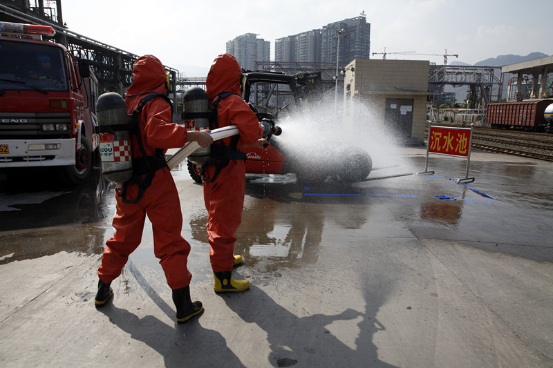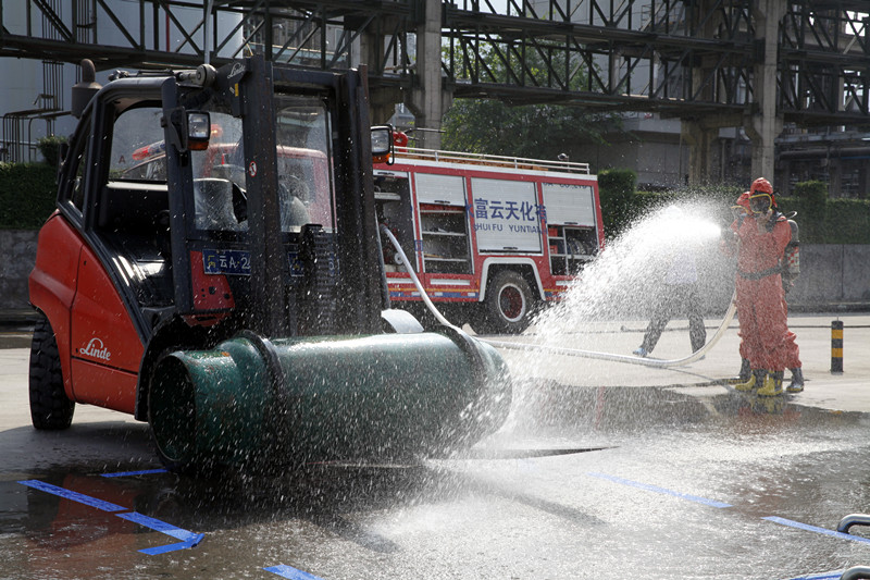 接到报告后,指挥组迅速启动《云南水富云天化危化品运输泄漏应急救援预案》,并赶赴事故现场指挥应急抢险工作。随即,警戒疏散组、消防抢险组、环境监测组等各应急专业组人员迅速赶赴现场,有条不紊的开展抢险救援工作。由于泄漏点无法得到控制,演习指挥组商议决定使用叉车将泄漏钢瓶运送到碱水池进行中和处理,半小时后,事故得到成功处置,险情排除。