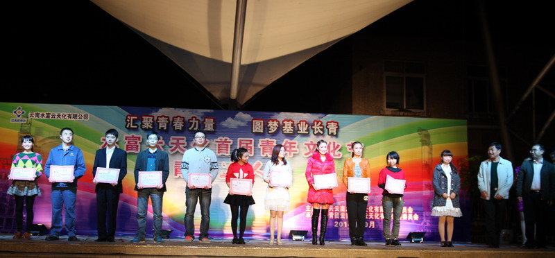 经过评选,当晚的青年达人秀节目中,《手中流畅出的美丽》、《妈妈不爱我》、《制气STYLE》、《让坐》、《英雄救义》、《我们的故事》、《我的青春在云天》、《我心飞翔》、《鲜花》、《在水一方》等10个节目获得了水富云天化首届青年文化节暨青年达人秀未来达人星奖项,公司党委工作部部长刘明、工会副主席李林为获奖者颁发了获奖证书;《春天的芭蕾》最终夺得了青年达人奖,公司党委书记梁洪为其颁发了获奖证书。