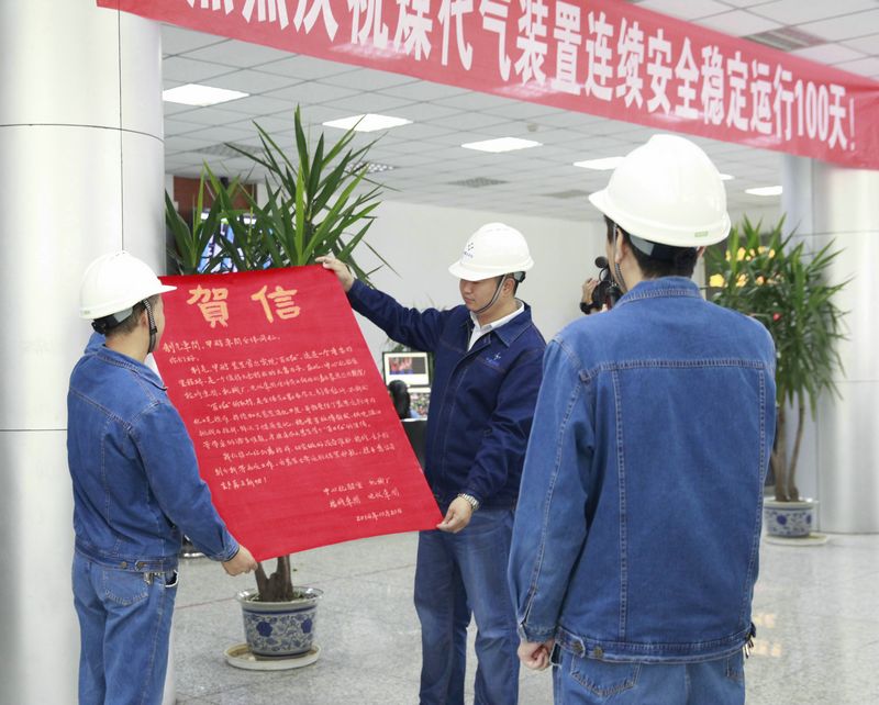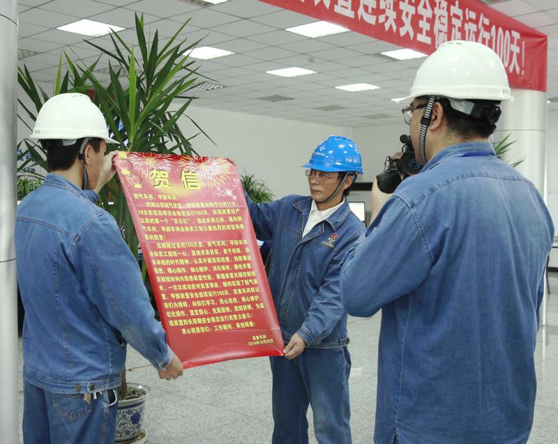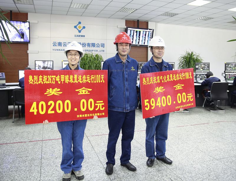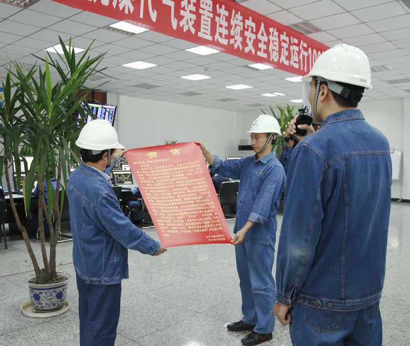 公司总经理陈林为制气、甲醇车间颁发奖金,并代表公司对制气、甲醇车间及相关单位的辛勤付出表示感谢和慰问。他说:“制气、甲醇装置能够安全连续稳定运行100天,刷新自己的运行纪录,非常高兴,在此,我代表公司经营班子对制气、甲醇车间取得的成绩致以最热烈的祝贺,对以制气、甲醇车间为代表的公司全体员工尽心尽力的工作表示衷心的感谢,希望制气、甲醇车间全体员工发扬成绩,再接再厉,开好管好装置,加强技术创新,解决装置存在的技术问题,加强巡检,及时消除缺陷,确保装置的安稳运行,为公司的生产经营做出更大的贡献。最后祝公司的各装置越开越好,祝公司的明天更加的美好。”