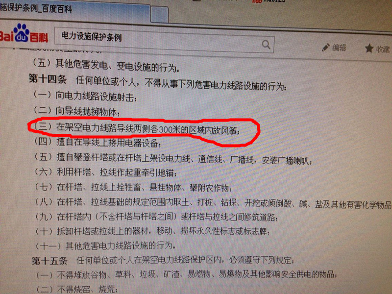 国家电力设施保护条例明确规定,在电力设施附近300米内禁止放风筝。