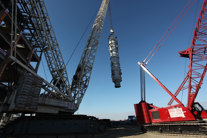 壳牌气化炉是原料及产品结构调整项目的核心设备,由中国五环工程有限公司、东方锅炉有限公司负责设计、制造,设备总高27.1米,外径3.91米,净重354吨,主要由外壳体、膜式水冷壁和激冷系统组成。由于设备重量大,安装位置高,对设备吊装的技术和安全要求非常高,为此金新化工在年前就积极组织设计方、施工方等相关单位召开专题讨论会,就气化炉吊装方案进行反复的讨论与修订,并于3月初最终确定吊装方案,随后,设备吊装各项准备工作紧锣密鼓的全面铺开。