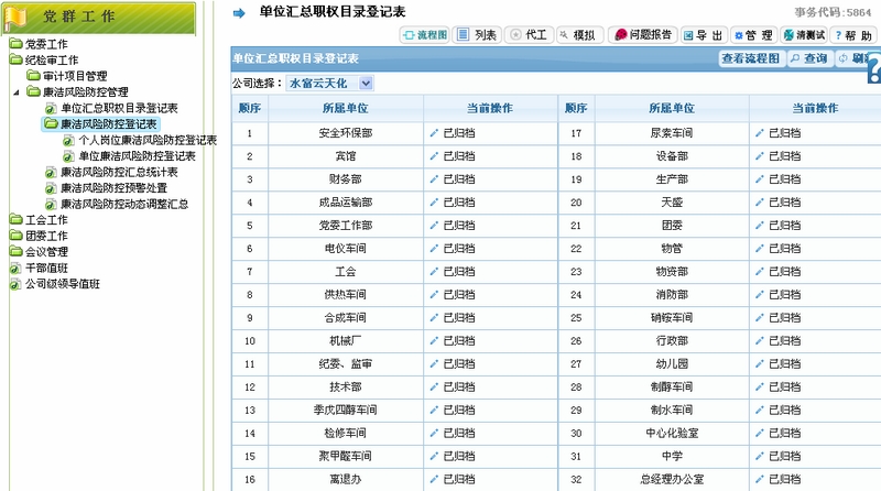 同时,廉洁风险防控是一项长期的系统性工作,需要及时更新,为便于动态管理,公司纪委办和信息中心联合开发了“廉洁风险防控管理”信息化模块,经过一段时间的试运行,效果较为理想,目前,各个单位已经完成职权目录,单位及单位正职的廉洁风险防控登记表的上传,公司全体员工均可登陆OA“党群工作”-“纪监审工作”-“廉洁风险防控管理”进行查看并监督。