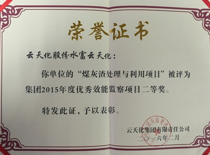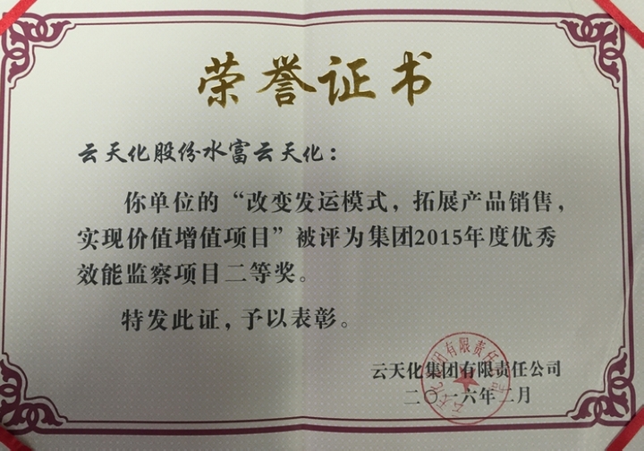 2015年,集团批准立项66个专题效能监察项目,在完成结题后,共优选了21个项目进行终评,经过层层评审,云天化集团评选出了10个优秀专题效能监察项目,其中,水富云天化“煤灰渣处理与利用”和“改变发运模式,拓展产品销售,实现价值增值”获得二等奖,“煤代气装置优化运行”获得三等奖。