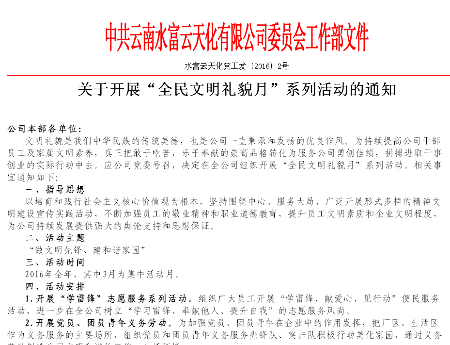 今年3月,在水富云天化党委的统一领导和部署下,下发了《关于开展“全民文明礼貌月”系列活动的通知》,云天化物管中心、水富云天化党委工作部、消防部、团委联合展开了一系列成效显著的活动。