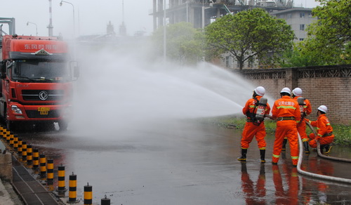 人两盘水带连接、泵浦车单干线出水操、油盆火灾的现场扑救演习等实际操作项目,培训要求每位应急分队人员人人过关,达到训练目的。
