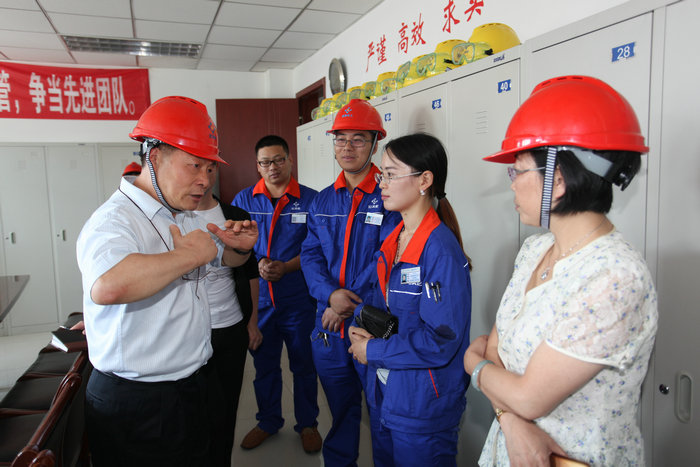 当天上午,金新化工召开“六型”班组创建汇报会。金新化工副总经理、工会主席简开忠就金新化工基本情况、工会工作、2016年生产经营状况以及“六型”班组建设具体推进等情况向刘富云一行进行了详细的汇报。随后,集团首批示范创建班组生产运营中心热电四班,安全环保生产部中心化验室综合班组就“六型”班组创建的具体措施、创建成果、特色工作以及创建过程中经验与思考进行了详细的汇报。随后,考核组一行还深入示范班组创建园地实地检查了“六型”班组创建效果。