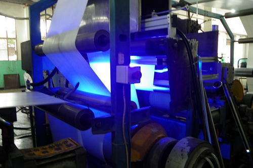 在天盛公司涂膜工段生产现场,涂膜机正在高速运转,与往日不同的是,装置上发出宝蓝色的光芒,这就是新投产的二维码喷印设备在工作,转瞬之间涂前布卷上就喷印出一枚枚清晰的“二维码”。