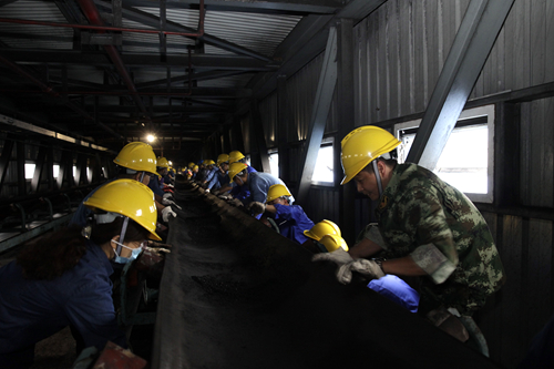 有序的分布在栈桥上,他们中有的是部分生产一线倒班员工,放弃休息,主动回到抢修现场,大家齐心协力,奋战在输煤栈桥上。由于V48110A输煤皮带停止运行后,皮带上积存了部分原料煤,皮带的重量也随之增大,再加上输煤栈桥坡度较大,这给皮带牵引工作带来了较大难度。困难面前,突击人员迎难而上,他们在指挥者响亮的口哨声下,喊着整齐的口号,一点一点地移动、传递着皮带,他们身姿矫健、步调一致、干劲十足,努力将皮带拉回框架中。