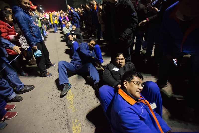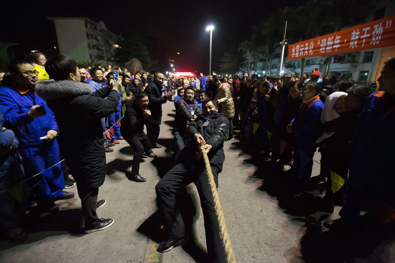 整个拔河比赛热闹非凡,比赛还未开始,赛场就已熙熙攘攘聚起了人群,一片喧哗热闹的景象,参赛选手们更是斗志昂扬、跃跃欲试。随着裁判的一声哨响,激烈对决正式开始,双方队员紧紧握住绳子,身子半蹲,重心下移,向后仰身,谁都不甘示弱,脸憋得通红,卯足了劲;特别是在维保事业部与化肥车间男队的半决赛中,双方可以说是势均力敌,难分仲伯,哨声一响起,绳子便开始静止不动,双方僵持不下,10余秒过后,绳子正中的吊坠才开始缓缓移动,队员们咬紧牙关,压低身体,甚至躺倒在地上,依然竭尽全力,气氛异常热烈;现场的拉拉队更是热情高涨,整齐划一的加油声气势如虹,喧嚣震耳。热火朝天的拔河比赛,为这个冬日的夜晚增添了一道独特的风景。