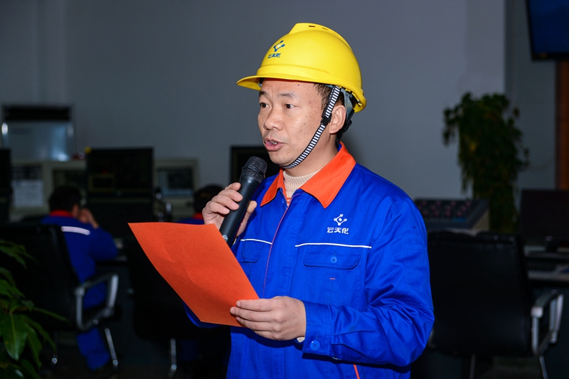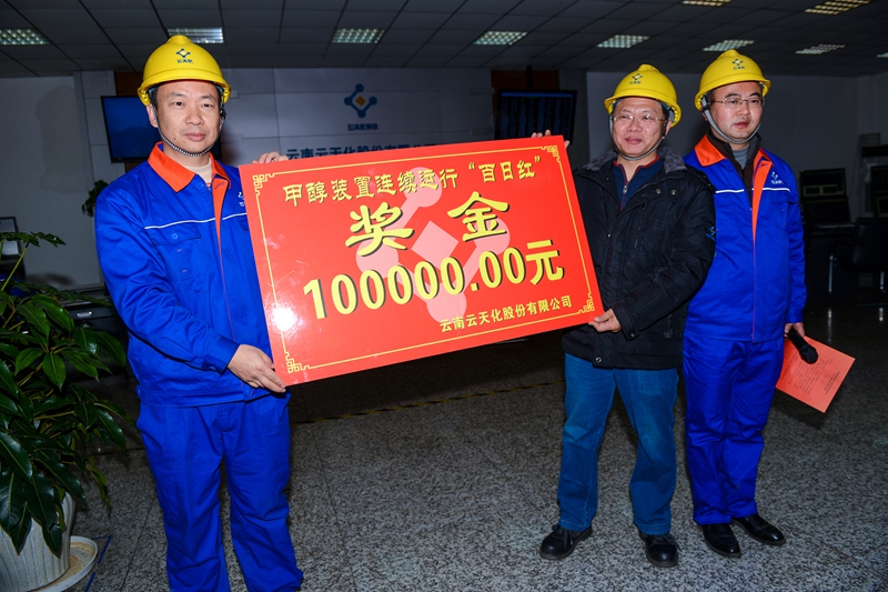股份公司安环监督部部长纳志辉代表股份公司向公司颁发奖金并宣读贺电。纳志辉谈到,水富云天化甲醇装置安全稳定连续运行100天,是水富云天化持续增强大型煤化工装置运行管理能力的具体体现,也是水富云天化生产管理水平的新提升、新突破。水富云天化是云天化的发源地,也是云天化“百日红”精神的诞生之地,希望水富云天化继续弘扬云天化“百日红”精神,继续弘扬云天化“安、稳、长、满、优”的长周期文化,始终坚持精益生产、达于至善的生产管理理念,以奋斗者为本,以价值创造者为本,坚定信心,乘势而为,以更加优异的工作成绩,为全面实现2018年生产经营目标而努力!