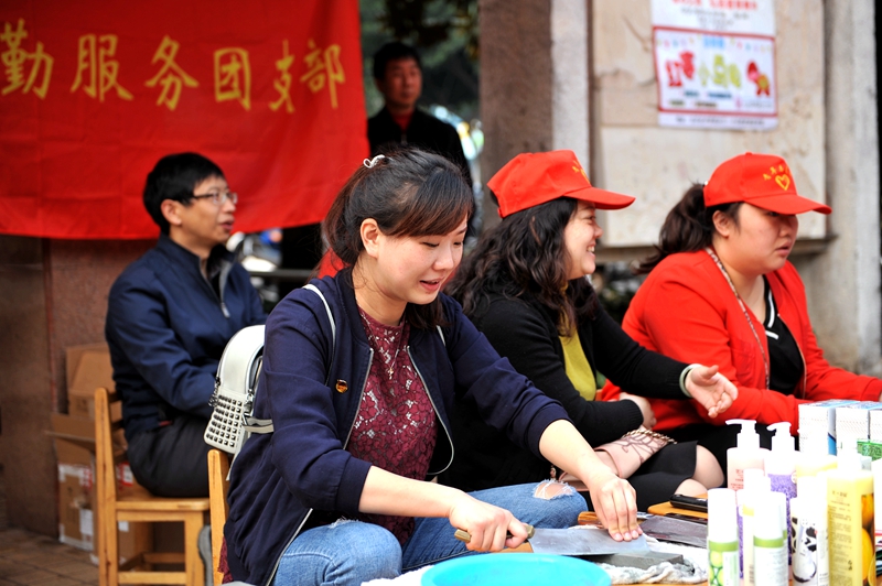 后勤服务团支部提供生活用品义卖、免费磨刀等服务