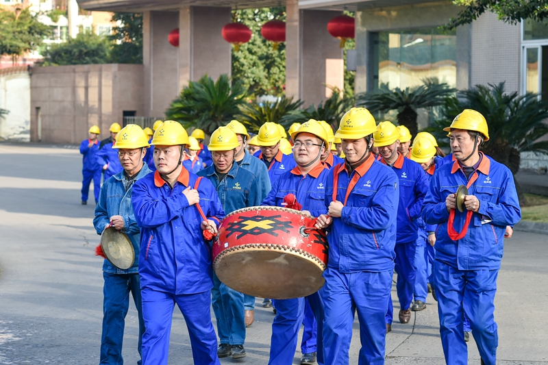 上午9时,公司领导杨志、杜伟,各专业副总、总监,中级管理人员及员工代表组成的祝捷队伍迎着金色的朝阳,踏着欢快的鼓点,前往甲醇车间进行祝贺。