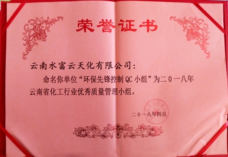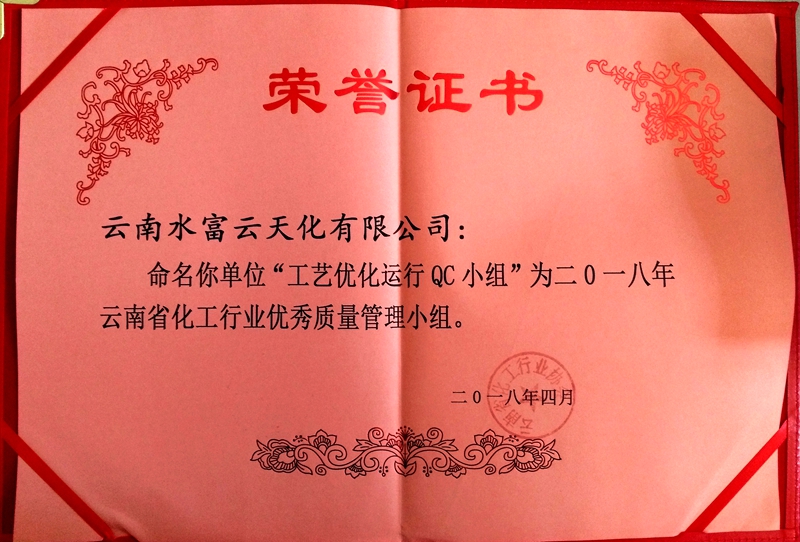 4月12日,在文山州丘北县举行的云南省化工行业质量协会QC发布会上,公司分别发布了《降低焚烧废液引起二氧化硫超高次数》、《降低澄清池出水浊度》两项QC成果,其中《降低焚烧废液引起二氧化硫超高次数》被选入2018年云南省质量协会QC成果发布会,两个QC小组均被命名为云南省化工行业优秀质量小组称号。