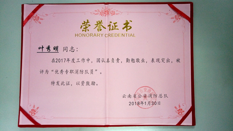 近日,云南省公安消防总队召开2017年度消防工作总结大会,对2017年度消防先进集体和优秀个人进行表彰,公司获评云南省2017年度“先进单位专职消防队”称号,同时叶秀明队长被评为优秀专职消防队员。