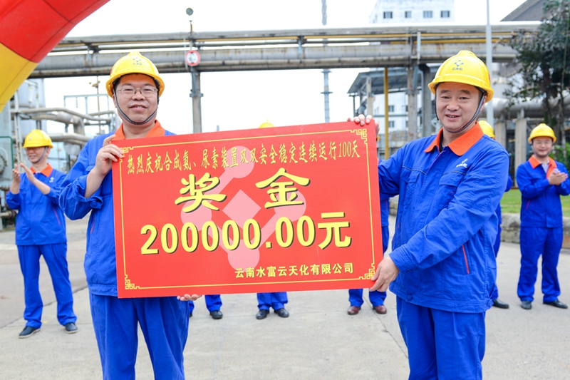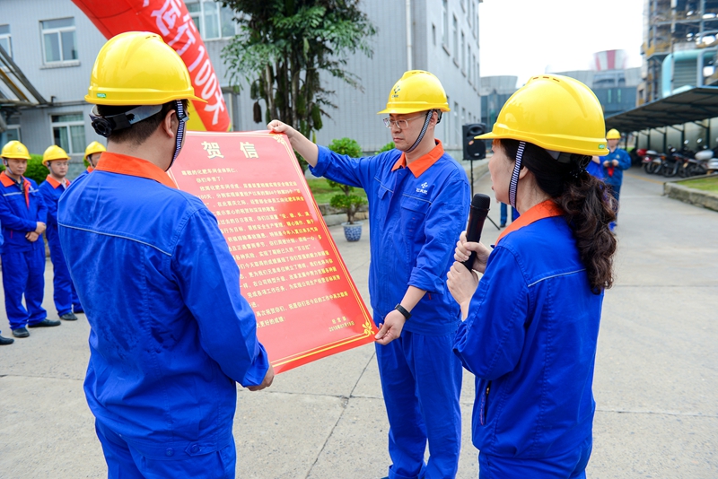 7月18日,合成氨、尿素装置现场分别传来捷报,两套装置双双实现连续安全稳定运行100天,迎来装置2018年的首个百日红。上午9时,公司领导班子,各专业副总、总监,中级管理人员以及员工代表组成的祝捷队伍,踏着欢快的步伐前往化肥车间祝捷。股份公司副总经理蒋太光、安环监督部部长纳志辉出席祝捷大会。