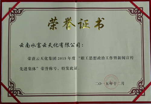 12月25日,云天化集团党委召开2015年度职工思想政治工作暨新闻宣传表彰会,会议对2015年度集团思想政治工作暨新闻宣传工作表现突出的单位和个人进行了表彰。水富云天化荣获集团“职工思想政治工作暨新闻宣传先进单位”称号。公司党委书记梁洪出席会议并领取了表彰。