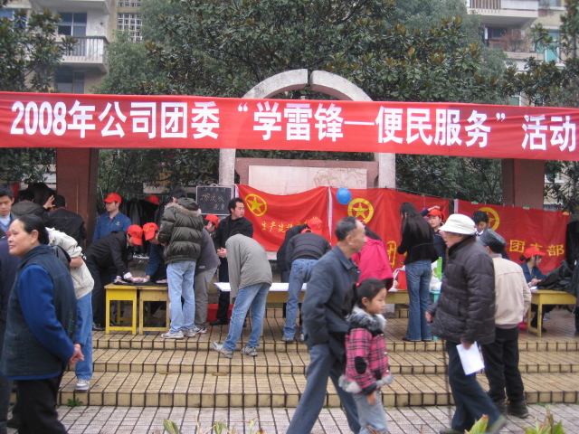 3月9日清晨,由公司团委主办的2008学雷锋活动一大早就拉开了帷幕。此次活动主要以公司团委牵头由各团支部组成,共有24个团支部参加,其活动丰富多样,有:擦皮衣、擦皮鞋、清洗电子仪器、零钞兑换、理财咨询、磨刀、健康咨询、手指护理、洗车打蜡、摄像知识咨询等等。最值得一提的是,公司团委特别为学雷锋活动精心准备的文艺节目表演和有奖知识问答,这不仅为广大青年朋友提供了展示自己的机会和平台,而且一定程度上提高了大家对雷锋精神的学习积极性。