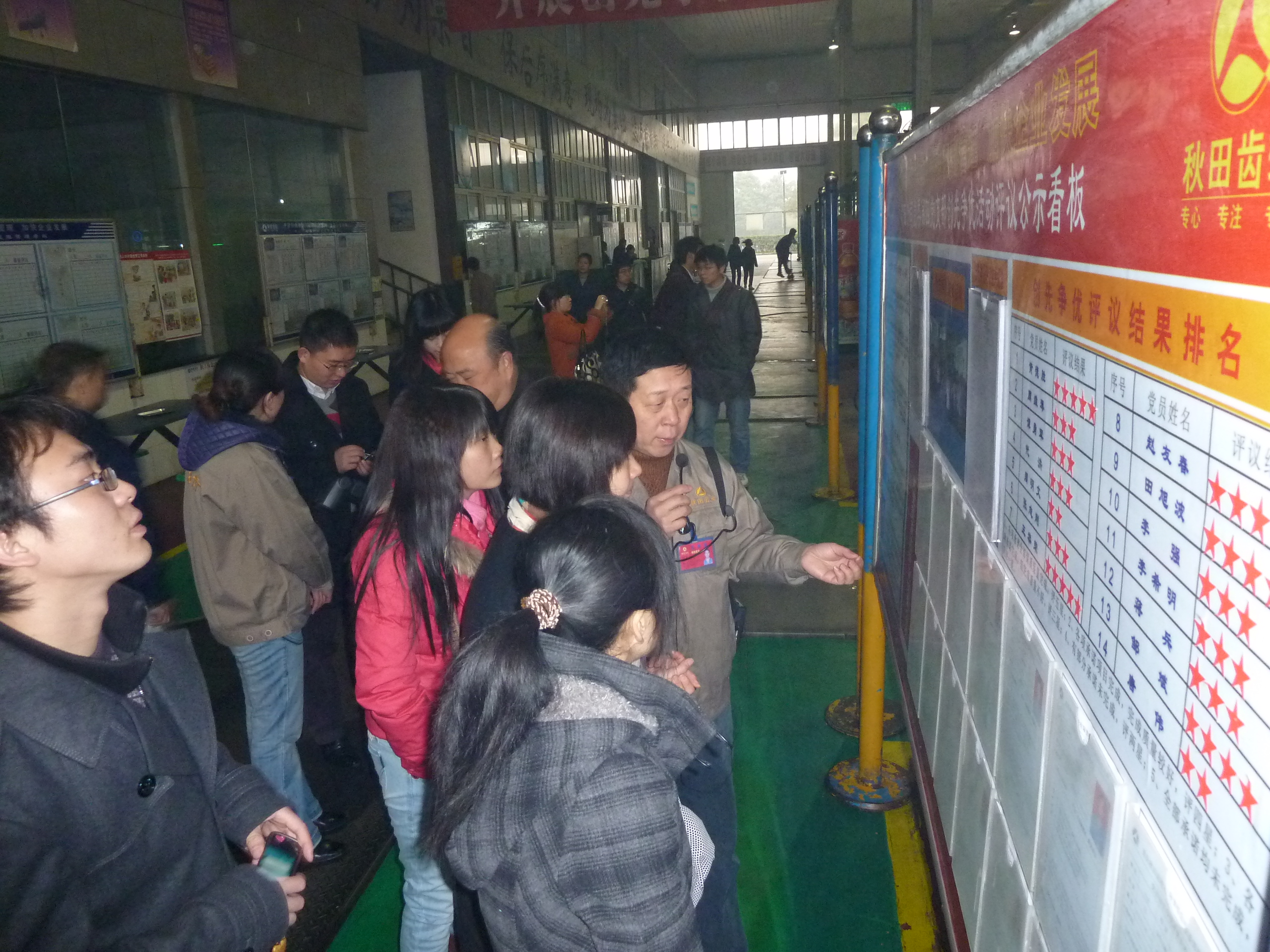 秋田齿轮有限责任公司位于重庆大渡口剑桥工业园区,是一家民营企业,其党建工作开展富有特色。27日一早,参观团来到园区,在园区黄主任的带领下,参观了园区党建“两新”示范基地,并进入园区秋田齿轮有限责任公司参观交流。通过现场讲解以及观看看板,重点学习了解了其围绕生产经营开展创先争优活动方面的党建工作先进做法,特别是“项目工作法”、“五能标兵”等特色载体的引入,使创先争优活动虚实结合,向纵深推进。此外,双方团委还就“党建带团建”工作进行了交流,主要听取了他们的经验介绍和主题活动开展情况,尤其是“废旧物资利用”、“节能降耗”、“单身派对”等活动让团干们大开眼界。