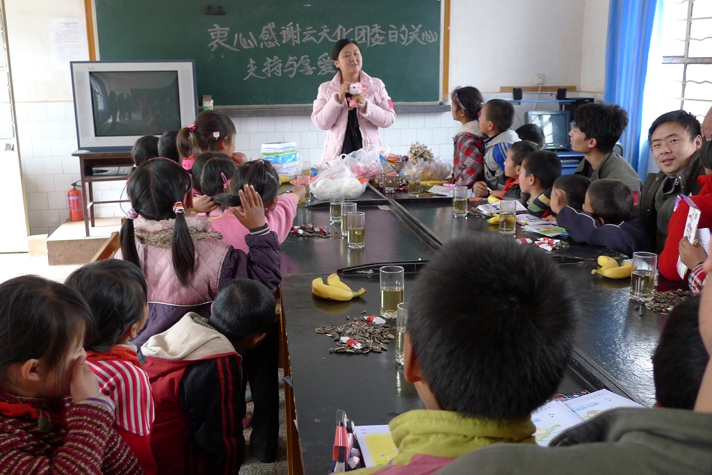 在老师的带领下,我们来到了小朋友们的教室。教室里的桌子非常陈旧,在上面我们还看见了久违的“三八线”,儿时的记忆突然涌上心头。黑板上是小朋友稚嫩的笔记写的“衷心感谢云天化团委的关心支持与厚爱”。值得一提的是,国家已经将村村通和视频教育系统普及到了每一个需要教育的角落,电脑、电视也走进了孩子们的课堂。