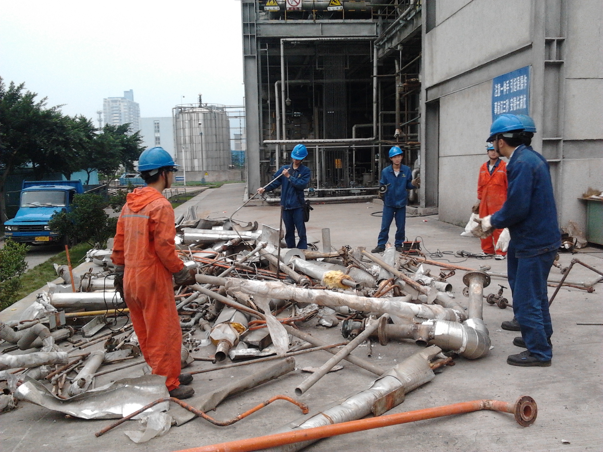 由于有机片区很多设备都采用价格较贵的不锈钢材料,而更换下的部分不锈钢钢管、阀门、盲板等还能够进行再次利用。10月26日上午08:05分,机械厂团支部9名成员出现在一套聚甲醛框架一楼,他们的任务是将本次大修更换下来的废旧材料进行回收再利用。