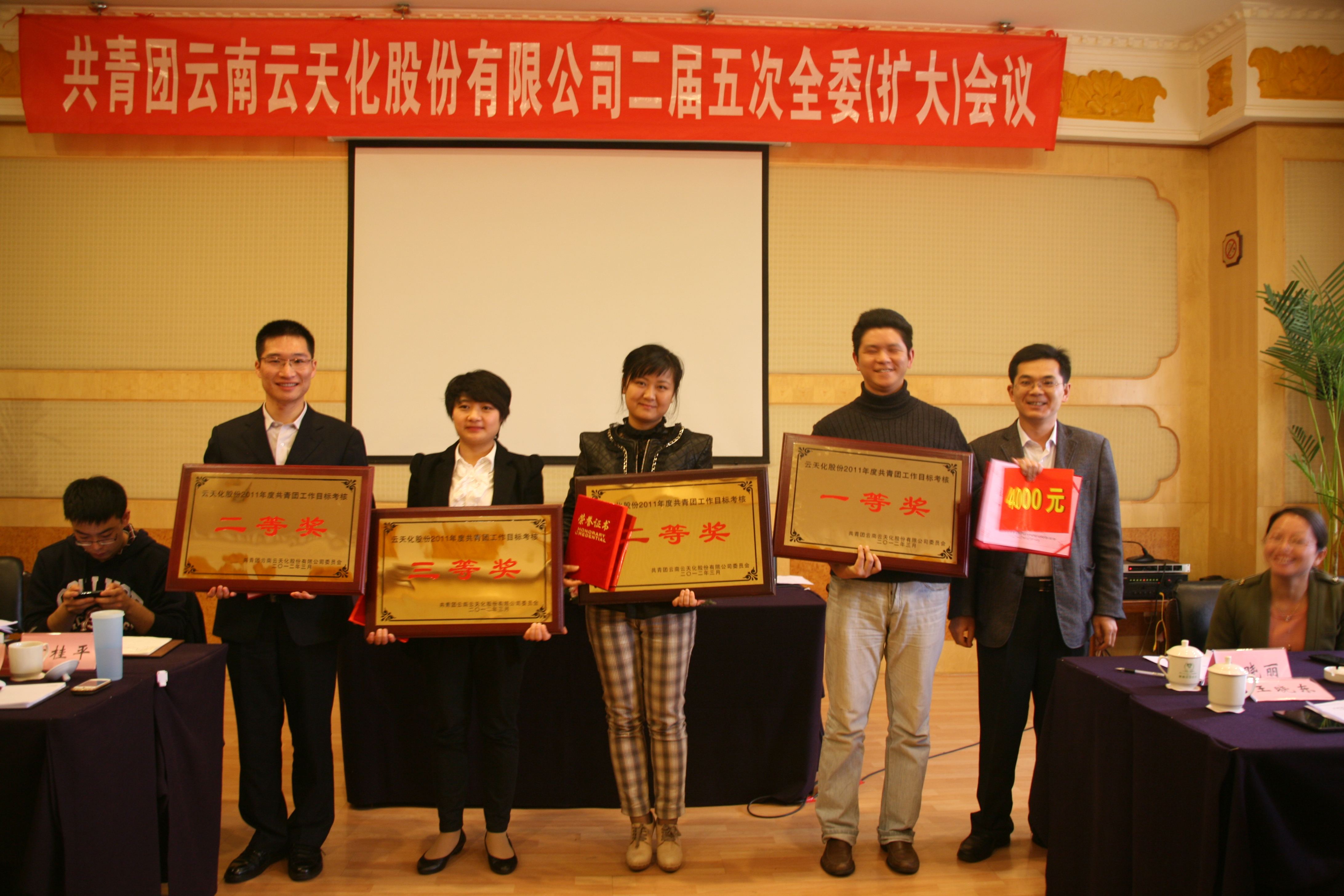 会议隆重表彰了公司2011年团内宣传工作获奖团体及个人、分(子)公司共青团工作目标考核获奖单位。天安化工团委、CPIC团委、金新化工团委、云天化股份重庆分公司团总支、云天化股份制气团支部、云天化股份尿素团支部、云天化股份中化团支部7个团组织荣获2011年度“团内优秀宣传工作组织奖”;杨静、周姝、罗小刚、周荣、彭颂柯、夏光辉、蒲崇清7名青年荣获团内年度“优秀宣传工作者”称号。金新化工团委荣获目标考核一等奖,天安化工团委、CPIC团委荣获目标考核二等奖,云天化股份重庆分公司团总支荣获目标考核三等奖。公司团委副书记李天会、集团团委副书记胡耀坤分别为获奖集体和个人颁发了奖金、奖牌和证书。